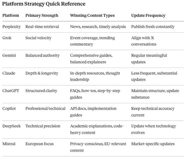 Instead of trying to make every piece of content work on every platform, we're building portfolios where different pieces serve different purposes. Some content is designed for immediate impact on Perplexity and Grok. Other content is designed for long-term value on Claude and Gemini. Yet other content targets the professional audience on Copilot.