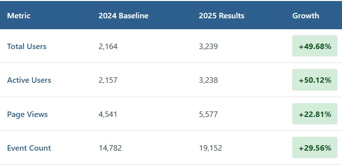The relatively lower growth in page views compared to users (22.81% vs 49.68%) actually indicates better-qualified traffic—users were finding what they needed more efficiently rather than having to hunt through multiple pages.