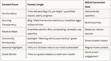 Push for honest, case-study-style blog posts ("How we tackled food waste," "Our biggest eco mistakes and what we learned," "Why we can't be completely zero-waste yet – and what we're doing about it").