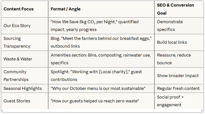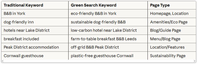 Modern SEO for B&Bs must shift towards long-tail, high-intent phrases that combine conventional queries with sustainability proof-points. For example: